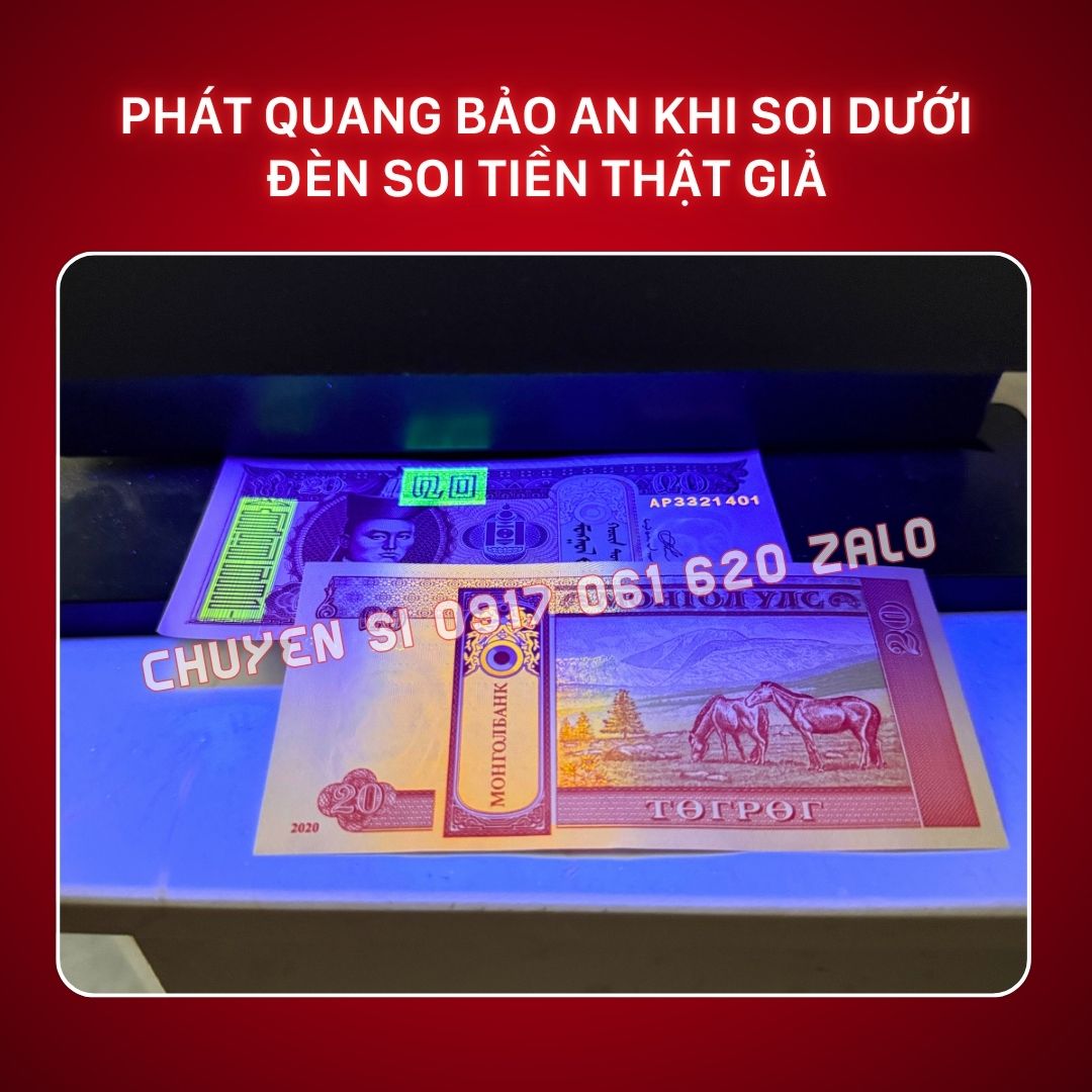 Là tiền thật, tờ tiền ngựa Mông Cổ 20 Tugrik có đầy đủ tính năng bảo an. Khi soi dưới đèn UV (đèn soi tiền thật giả), các chi tiết chìm sẽ phát quang rực rỡ. Tính năng này không chỉ chứng minh đây là tiền thật mà còn làm tăng giá trị sưu tầm.