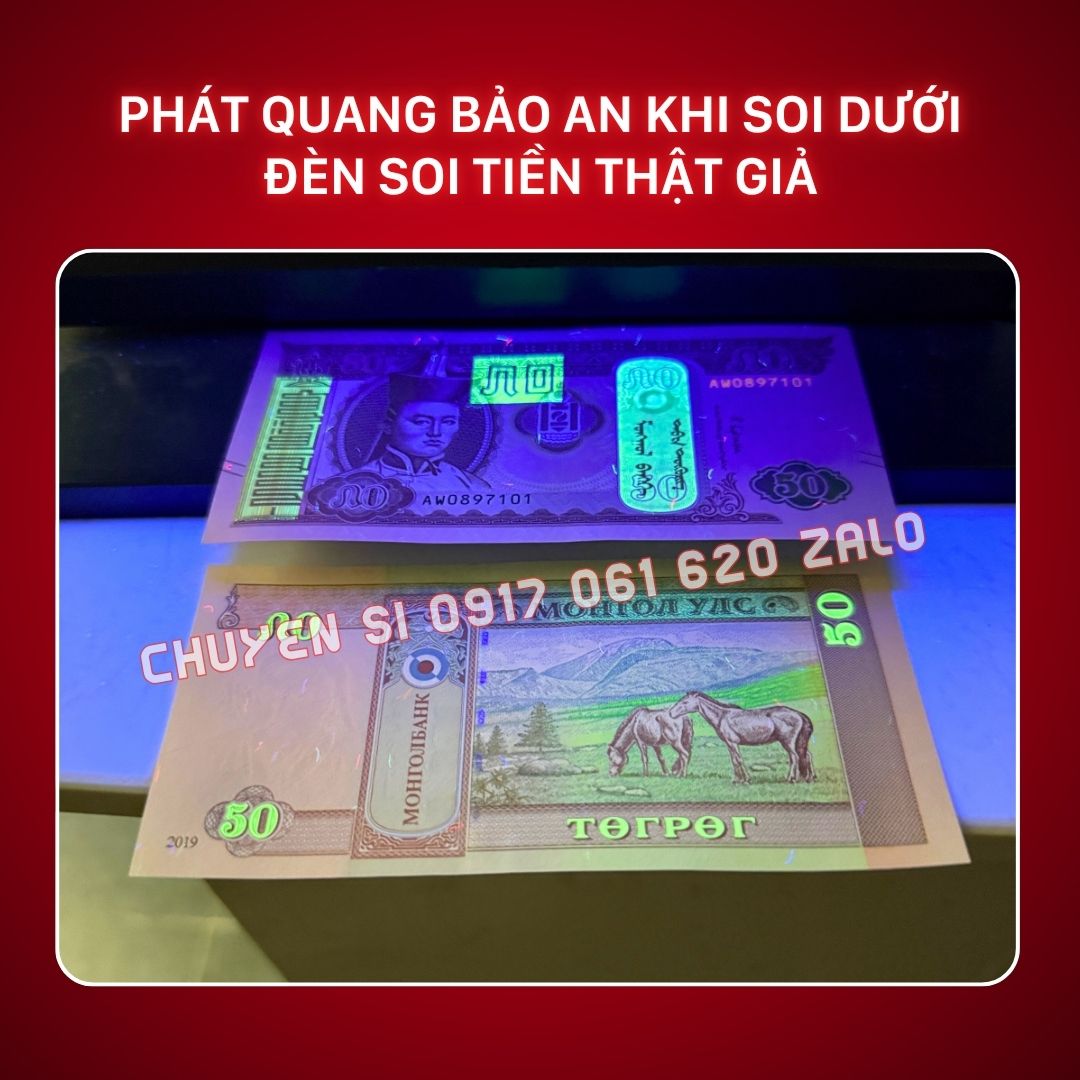 Là tiền thật, tờ tiền ngựa Mông Cổ 50 Tugrik có đầy đủ tính năng bảo an. Khi soi dưới đèn UV (đèn soi tiền thật giả), các chi tiết chìm, mệnh giá và dải an ninh sẽ phát quang rực rỡ. Tính năng này chứng minh đây là tiền thật 100% và làm tăng giá trị sưu tầm.