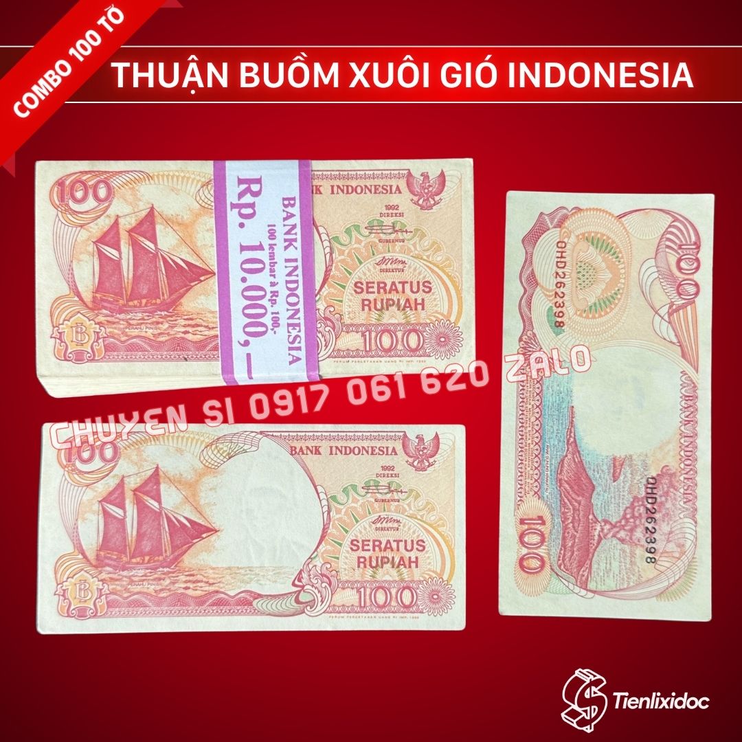 Combo 100 tờ Tiền Thuận Buồm Xuôi Gió Indonesia (mệnh giá 100 Rupiah, năm 1992) là lựa chọn số 1. Với tông màu đỏ rực rỡ và hình ảnh con thuyền căng gió, đây là món quà lì xì ý nghĩa “Đầu Xuôi Đuôi Lọt” được ưa chuộng nhất mỗi dịp Tết.