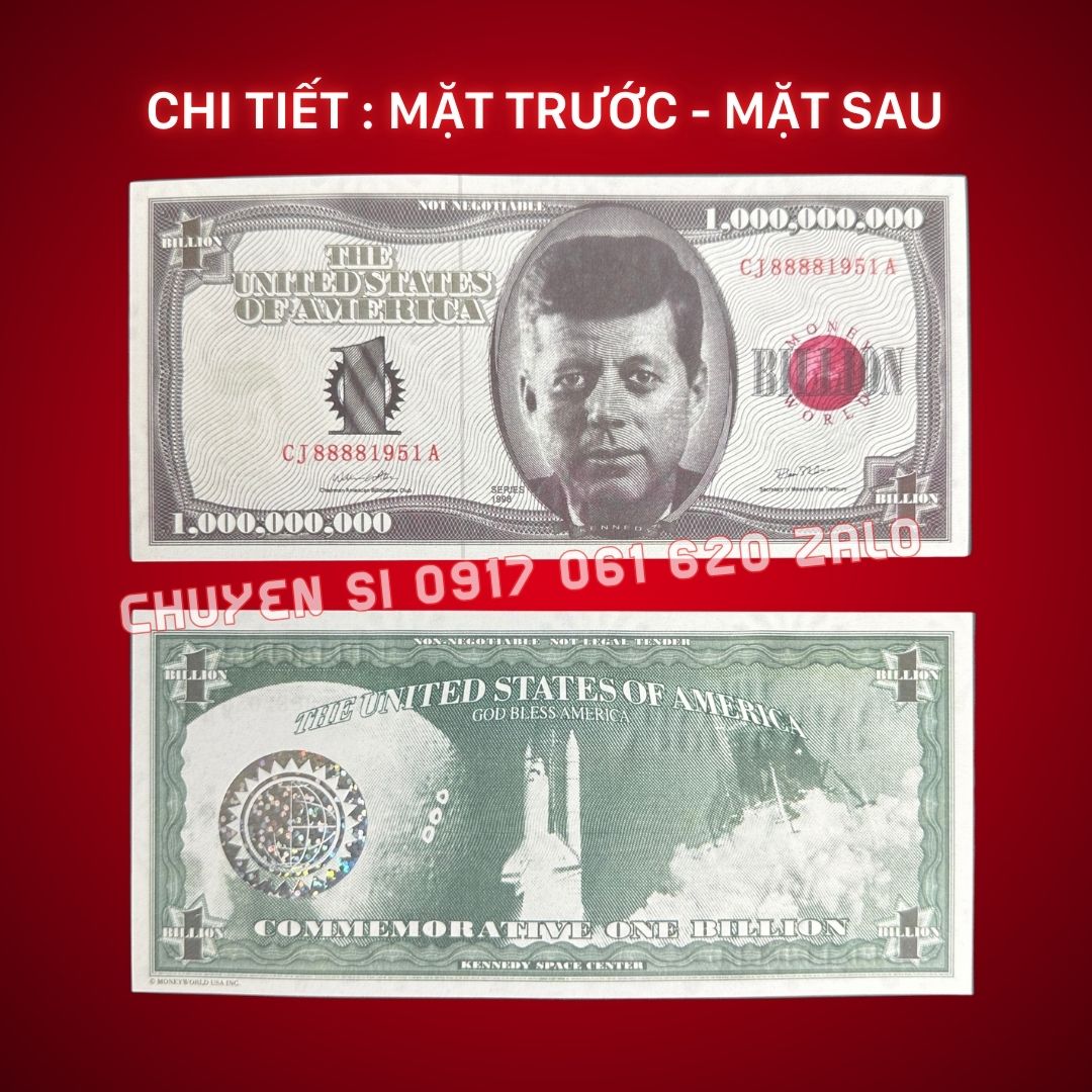 Mặt trước in hình chân dung Tổng thống John F. Kennedy. Ông là một trong những vị tổng thống vĩ đại và được yêu mến nhất lịch sử Hoa Kỳ. Hình ảnh của ông tượng trưng cho sự lãnh đạo tài ba, sức trẻ và tầm nhìn đổi mới. Con số 1,000,000,000 được in sắc nét ở 4 góc, khẳng định giá trị “tỷ phú” của tờ tiền.