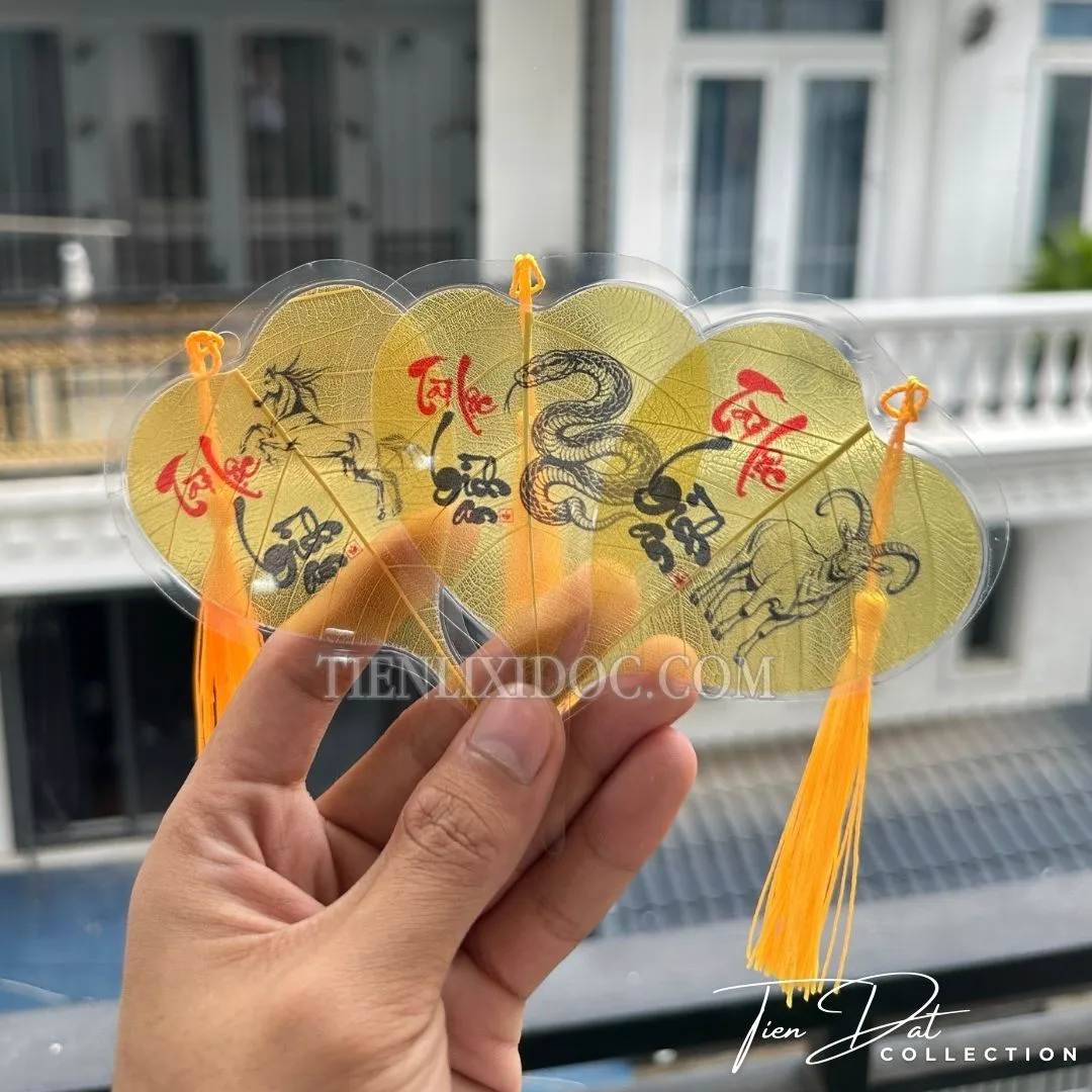 Trên mỗi lá là hình vẽ linh vật đại diện cho năm sinh, kết hợp cùng chữ thư pháp ý nghĩa như “Phúc”, “Lộc”, “An”, mang lại vượng khí, bình an và tài lộc cho người sở hữu.