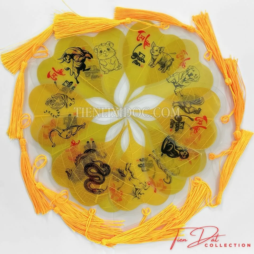Hình ảnh 12 Con Giáp Việt Nam trên lá bồ đề là sự kết hợp hài hòa giữa văn hóa Phật giáo và phong thủy truyền thống Việt Nam. Mỗi chiếc lá bồ đề thật được ép plastic bền chắc, giữ nguyên hình dáng tự nhiên và in hình mười hai con giáp theo năm sinh theo thứ tự Tý, Sửu, Dần, Mão, Thìn, Tỵ, Ngọ, Mùi, Thân, Dậu, Tuất, Hợi.