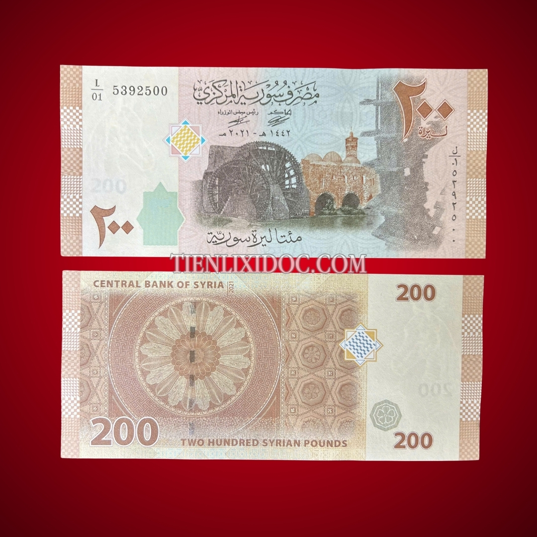 - Với tông màu nâu ấm, tờ Syria 200 Pound 2010 UNC tượng trưng cho sự ổn định, bền vững và thịnh vượng lâu dài.